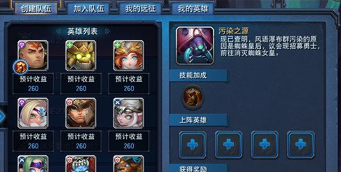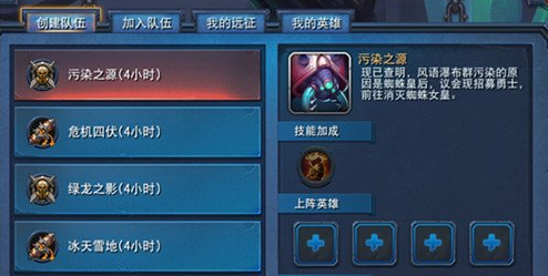 选择任务后,点击上阵英雄中的"+"即可开始上阵英雄,若玩家拥有满足远征任务的技能要求的英雄,则会显示在上阵英雄列表的首位