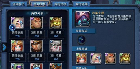 点击"加入远征"标签后可以看到当前准备中的所有队伍,玩家可以选择任意一支队伍,并派遣一个英雄加入