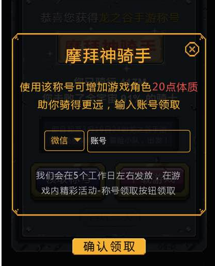 首先介绍下摩拜神骑手的属性,使用该称号可以增加游戏角色20点体质,助你骑得更远。在领取界面输入自己的微信账号,看清楚了,是账号!不一定是手机号码!然后就能获得这个给力的称号了。