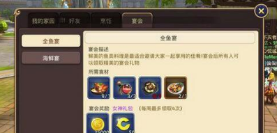 鲜美的鱼类料理是最适合邀请大家一起享用的佳肴,宴会后所有人可以领取精美的宴会礼物。宴会必须在您的家园中至少有4人时才会开启。宴会开启后,将会和家园中友好度最高的3人一起享受美酒佳肴。