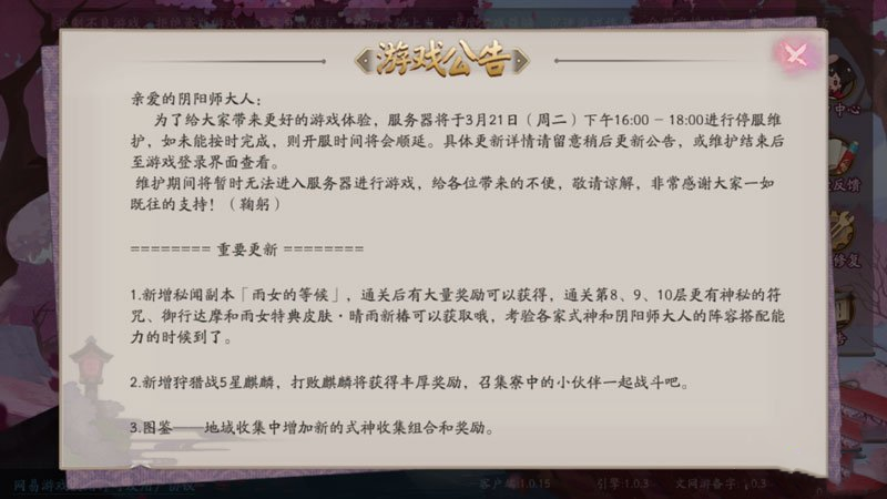 阴阳师体验服3月21日更新:秘闻副本[雨女的等候]和五星麒麟全新登场,下面就来汇总下本次更新的内容都有哪些,后续补充相关的攻略资料。