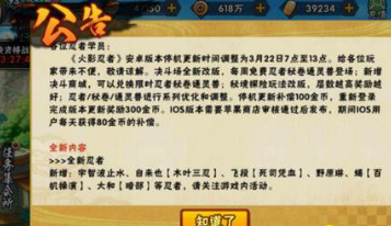 以上就是火影忍者手游3月22日更新详情,本次维护时间为7点-13点,预计要到下午才能完成哦。