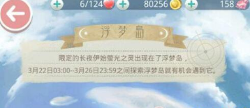 限定的长夜伊始萤光之灵出现在了浮梦岛,3月22号3点-3月26号23点59分之间探索浮梦岛就有机会遇到它。根据小编的观察,有600钻出的,有900钻出的,也有免费出的,基本上都是二三十次的样子。