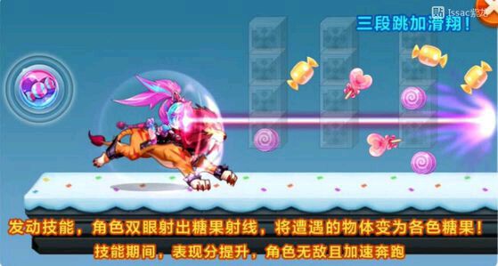 镭射妖姬发动技能,角色双眼射出糖果射线,将遭遇的物体变成各种糖果。技能期间,表现分提升,角色无敌,而且加速奔跑。
