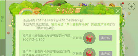 使用“羊小暖和羊小美”(光环)参加3局游戏(自由或团战),可得森林春装礼盒:金蘑菇*30,入场券*1