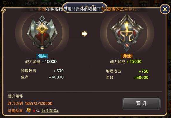 勇士战力加成:15000;物理攻击+750;生命+60000。