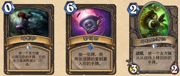 打出4个名称相同的随从牌,这要怎么完成?选择之一是使用“暗影步”和“年轻的酒仙”之类可以将随从返还手牌的卡。另一种方法是使用“菊花茶”或“拟态豆荚”之类复制随从的卡牌。