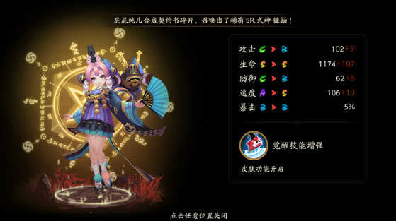 金鱼.助阵:金鱼姬召唤一条金鱼助战,金鱼继承金鱼姬48%(满级66%)生命和100%攻击,在友方受到伤害时,金鱼会分担40%伤害。(优先于薙魂触发)满级附带金鱼普攻66%概率击退目标30%行动条
