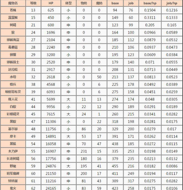 1.怪物总经验(BASE+JOB)随怪物等级提升,但BASE和JOB的分配比例各不相同。