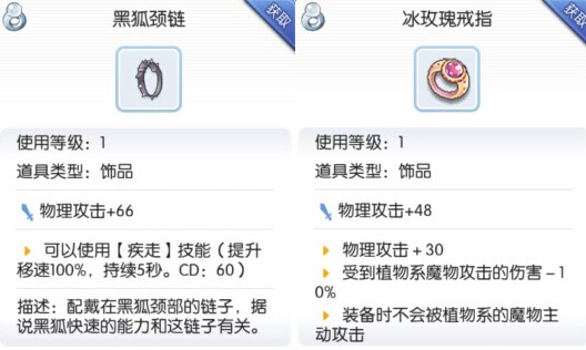 冰玫瑰戒指:物理攻击+48,物理攻击+30,受到植物系魔物攻击的伤害-10%,装备时不会被植物系的魔物主动攻击。
