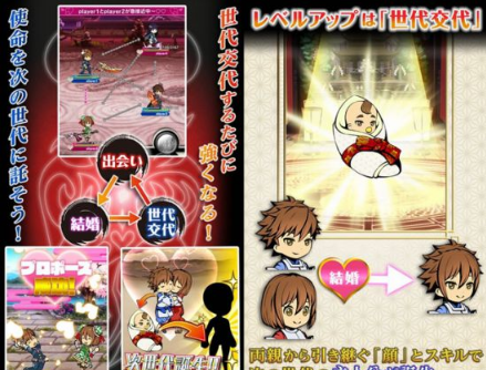 在游戏中,玩家会操作角色进行相遇,结婚和世代代变更的三个步骤,而三个步骤都是循环的,玩家需要不断进行这三个步骤诞下一个最强的主角。游戏的主要玩法包括实时制的战斗,寻找结婚对象,求婚后进行世代交替,可以说是一款以结婚生子为主题的游戏。