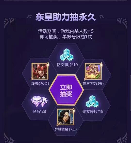活动期间登陆游戏就可以领取登陆礼包,如果玩家在游戏中击杀人数≥5人时还可以获得一次抽奖机会,最高奖励永久英雄廉颇哦。(没有规定一定要使用新英雄才算击杀人数)
