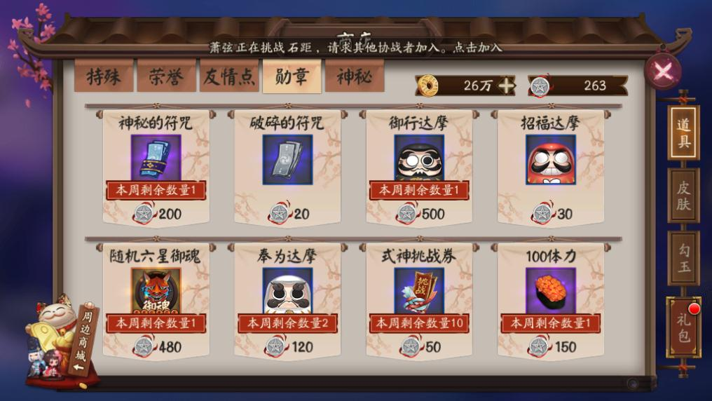 阴阳师勋章商店目前在正式服已经更新六星御魂,奉为达摩,式神挑战券,100体力。具体数据见下图: