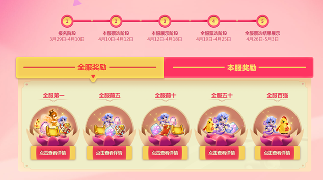 2.本服评选阶段阳光男生、魅力女生组的第1名将会进入全服评选阶段并获得特殊称谓和本服长安城雕像特权(如果合服只保留目标服务器玩家雕像)