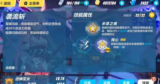 袭流斩:极限闪避,周身爆发剑气,对附近怪物造成30%攻击力伤害。极限闪避成功时,附加绯樱标记。