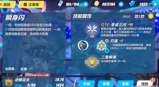 瞬身闪:对目标造成50%攻击力的伤害。一闪攻击到携带绯樱标记的角色时,一闪结束后触发刃返,造成极大伤害