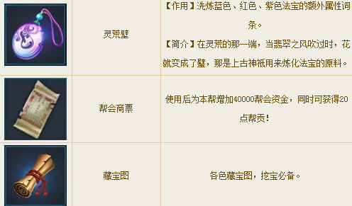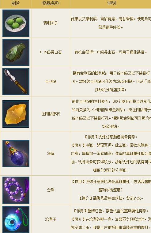奖励内容:玩家有几率获得清明团子(使用后可获得大量经验)、1-15级吴山石、1级金刚钻、金刚钻原石、净瓶、念珠、沧海玉、灵荒壁、帮会商票、21级藏宝图等奖励。