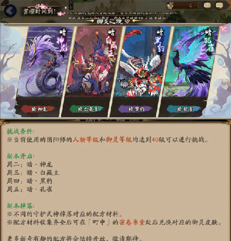 每周周二~周五开放对应的守护式神御灵副本,分别是暗·神龙、暗·白藏主、暗·黑豹、暗·孔雀