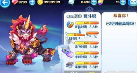 酷跑模式技能:超级奖励关得分6.5倍,穿越奖励关得分4.0倍。冥斗狮的技能是角色的主动冲锋技能,有概率获得时间延长。定期召唤黑色流星。进入超级、穿越奖励关时,持续变大一段时间。期间表现分提升。