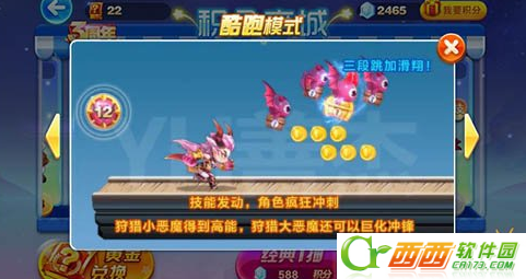 多人对战技能:速度型:开局强力冲刺。发动技能冲刺,狩猎恶魔可以带来高能,带你疯狂冲锋。三段跳加滑翔