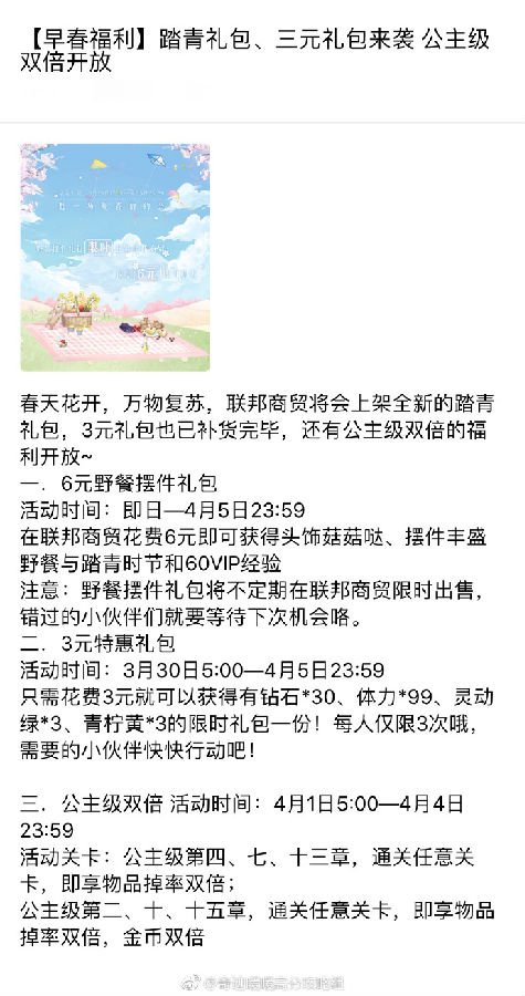 此外,与野餐摆件礼包一同上架的还有一个3元特惠礼包,可以获得30钻石、99体力和3灵动绿、3青柠黄。