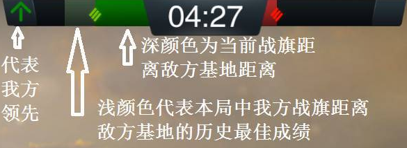 在界面的最上方,有一个推进进度条,深颜色部分表示当前战旗距离敌方基地距离,而浅颜色的部分,则代表在本局中我方战旗距离敌方基地的历史最佳成绩。