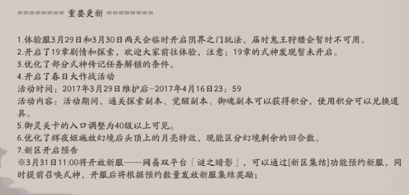 阴阳师抢先体验服将在3月29日16:00-18:00进行临时停服维护,预计时间2小时,请大家等待维护后再进行登录游戏。下面来看看更新了哪些内容。