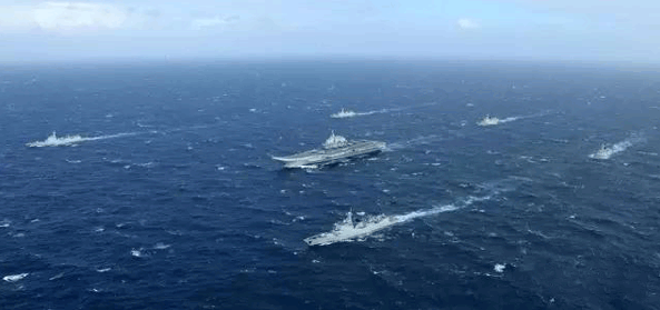 “辽宁”舰前面两艘战舰为052D型驱逐舰,旁边的两艘为056型护卫舰