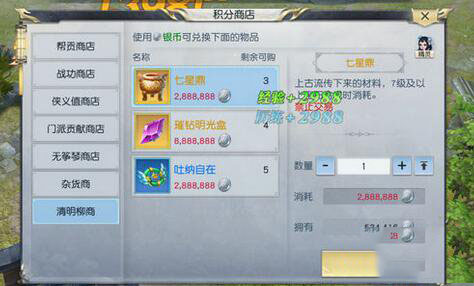在清明柳商处可以购买七星鼎、璀钻明光盒、历练等等。清明柳商只开放一周时间,将会在下周维护后离开。