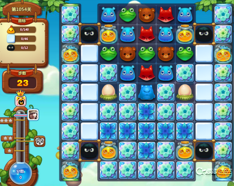 第1054关要消除的目标还是比较多的。小黄鸡啊冰块啊还有毛球啊。特别是小黄鸡,是一个很大的难点,因为要消除的小黄鸡数量很多,达到140个,哎呀我的妈,那怕是有点嗨啊。