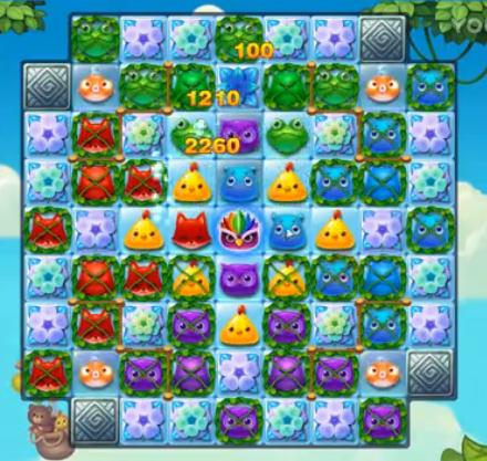 开局的时候,先消除可以消除的,随着藤条的慢慢消除,空间变大,可以合成大量的特效哟。然后可以多多借助特殊道具,多合成4消特效,然后靠着完整的地图,时候很容易制作出魔力鸟的,将魔力鸟与特效交叉消除,可以瞬间消除大量的冰块哟。