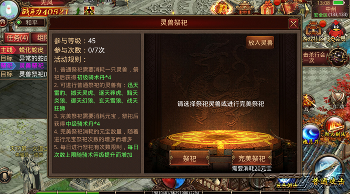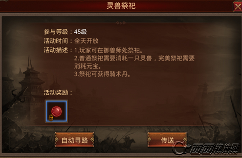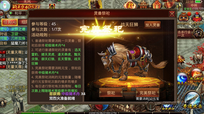 灵兽祭祀是我们每天可以进行的一个灵兽系统玩法,在这个活动中,我们可以收获提升骑术等级的骑术丹,骑术丹的品质也是根据我们消耗的内容不同而有所不同。其中普通祭祀,将消耗一只灵兽,祭祀后将会获得初级骑术丹,完美祭祀则是会消耗元宝,不会让灵兽消失,祭祀后将会获得中级骑术丹,而且完美祭祀所消耗的元宝数量将会随着元宝祭祀的次数增多而增多。当然也不是所有的灵兽都可以被用来祭祀的,主要是一些中低端的灵兽品种,分别有迅天雷豹、憾天灵虎、逐天莽虎、黯天炎狼、御天幻狼、玄天雪狼、战天狂狮。