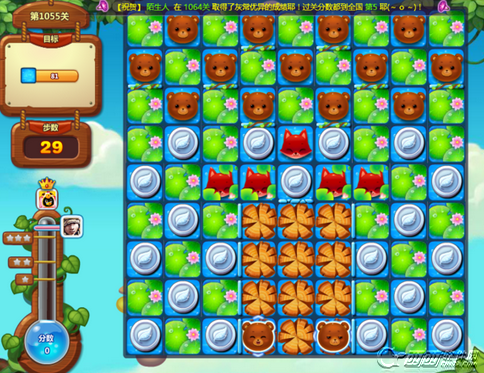 首先可以先从最中间的红色小狐狸开始消除,红色小狐狸和银色叶子银币可以交换,消除一部分,同时可以获得一只魔力鸟掉落到最底部。而最底部有2只特殊棋子。交叉消除,可以将目前棋盘上的所有小熊都消除掉,同时消除大量的荷塘哦。所以第一步是非常关键的。