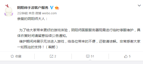 为了给大家带来更好的游戏体验,阴阳师国服服务器现需进行临时停服维护,具体恢复时间请留意后续公告通知。