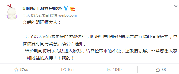 为了给大家带来更好的游戏体验,阴阳师国服服务器现需进行临时停服维护,具体恢复时间请留意后续公告通知。