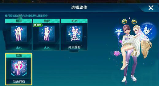 如上图所示,情侣的动作目前有4个,分别是相知、相爱、热恋、结婚。