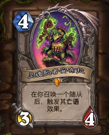 炉石传说灵魂歌者安布拉可以和哪些卡搭配,灵魂歌者安布拉卡牌搭配推荐,炉石传说灵魂歌者安布拉是可以触发亡语随从,同时灵魂歌者安布拉只需要4费,可以最高搭配6费亡语随从,是不是很多人想到了女王,下面带来炉石传说灵魂歌者安布拉卡牌搭配推荐。
