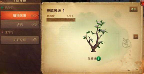 目前开放的生活技能仅有两种,一是植物采集、二是矿石挖掘。附带衍生技能是铁匠和纺织。