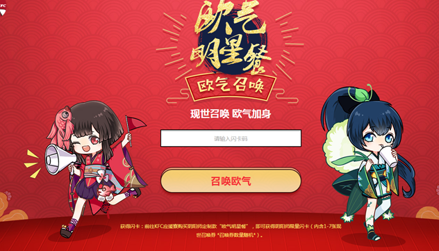 4月1日-4月16日,前往全国5000余家KFC应援寮,购买阴阳师定制款“欧气明星餐”(主题餐盒限量100万份)即可获得阴阳师限量闪卡(限量300万张)