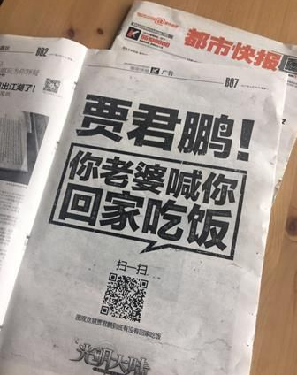 该广告的刊出顿时引爆网友热议:8年前,那个游戏与青春的记忆被再次唤醒。今晚7点,游戏大咖苍天哥带队,直播探寻贾君鹏的住处,带领所有玩家去寻找那个年代的开荒回忆。贾君鹏,他会出现吗?