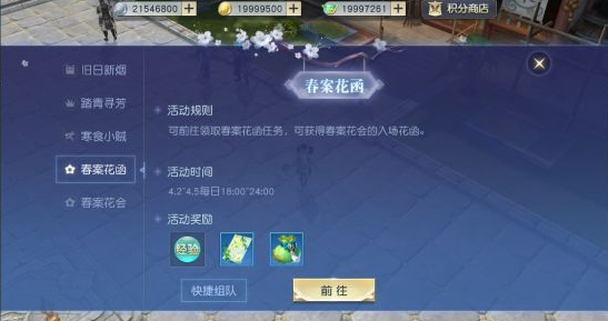 活动期间每天12点至23点,偷取各宗门寒食物资的小贼将会出现。每个整点,天命者们都可以前往六大宗门击退这些小贼、夺回寒食,并收获宗门给予的经验、银币、珍稀道具等丰厚奖励!需要注意的是,每个小贼都需要不同的职业组合方能挑战。
