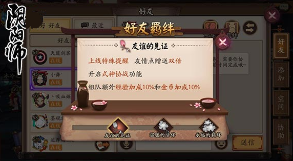 达成亲友关系可以解锁亲友协战,可以使用亲友的式神进行剧情、探索、御魂觉醒桃战;