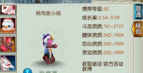 目前该稀有宠物还没有正式上线,官网也没有发布任何通知,估计会在清明节之后上线吧。玩家需要达到50级才可以携带姜小萌哦,一般这种新出的稀有宠物都是充值活动送的奖励,大家到时候再看看吧。