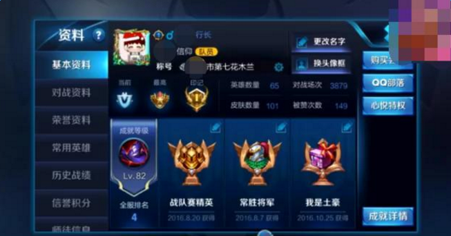 2700的累计积分看的心里一颤,这得是什么样的精神才能如此的强势,回首看看自己不到2000分的大号,前50区的小编还不如这位100区以后的玩家。看来小编的游戏精神有待提高啊。从该玩家的资料图中可以看出,绝对的骨灰级玩家,66位英雄有65位,估计没有的那个就是绝版的艾琳了。对战场次3879场。皮肤101个,土豪玩家呀。个人实力也是王者级别。成就等级更是以82级排在全服第四名。