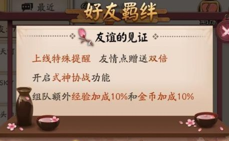 达到第一级“友谊的见证”可获得:上线特殊提醒、友情点赠送双倍、式神协战(就是带着好友的式神刷狗粮)、组队额外经验加成10%和金币10%。