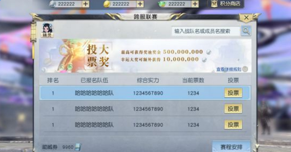 由于跨服联赛报名战队众多,因此每个服务器限制仅有两支战队能在如云强者中脱颖而出,代表服务器出战——决定去留的方式,将是接受全服所有天命者的投票,只有大家公认的强者方有资格代表所在服务器登上云台、迎战天下群英!
