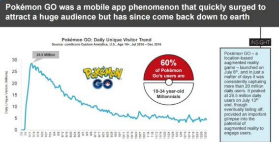 根据年度报告所述的数据显示,最高峰时期的日活跃用户高达2,850万,用户中有六成人年龄是于18至34岁的区间。由上图可见12月12日的版本更新以及圣诞版本皮卡丘的确为游戏提升了一定热度,可惜的是很快退烧,于2016年底,日活跃用户约在500万左右。