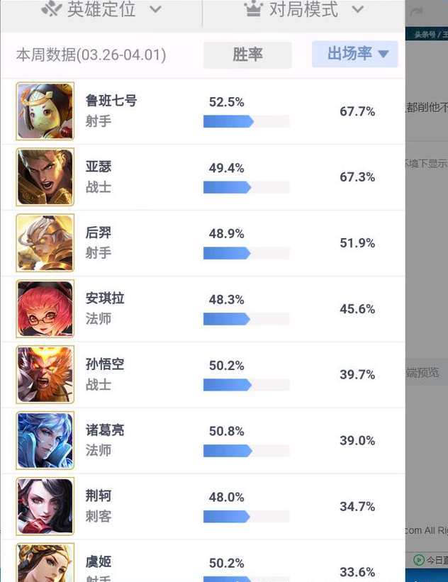 鲁班七号 没错我们的鲁班大师登顶了,拥有着版本亲儿子的待遇,别人都削他不削就是增强,可以看到不论是出场率以及胜率都是碾压其他射手的,果然有2888皮肤的不好惹