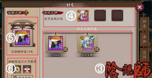 你的亲友们协助的式神会出现在这里,以好友上架时的御魂属性为准,对方再调整也不影响。这个不会提升经验。结算的时候,看不到好友的这个式神。