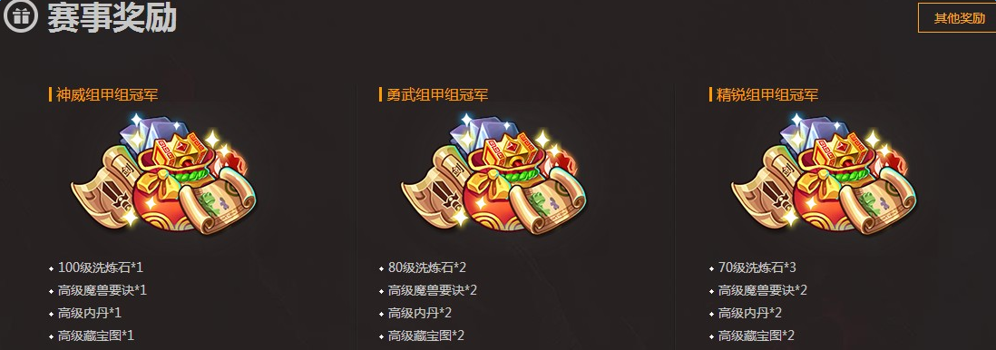 为了感谢所有玩家对于X9联赛的支持,《梦幻西游》手游在本届X9联赛中也对各大组别冠军战队奖励进行了全面升级。其中神威组甲组冠军成员将获得一个100级洗炼石、高级魔兽要诀、高级内丹、高级藏宝图一份;勇武组甲组冠军战队成员将获得80洗炼石、高级魔兽要诀、高级内丹、高级藏宝图各两份;精锐组甲组冠军战队成员将获得三份70洗炼石以及高级魔兽要诀、高级内丹、高级藏宝图各两份。相信这些丰厚的奖励,必定能够吸引更多的顶尖高手,加入到这一赛事之中!